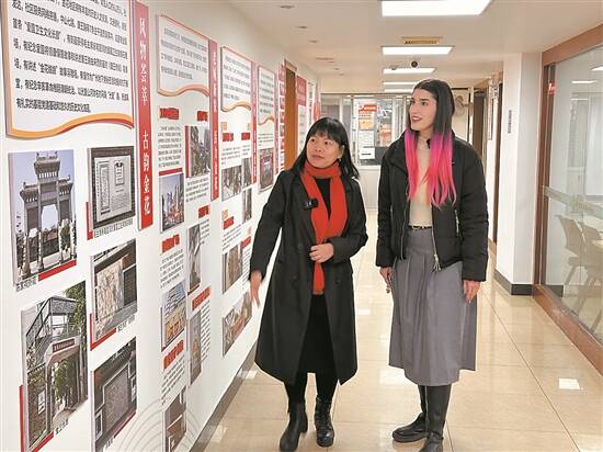 区燕明(左)向多斯塔娜介绍社区工作