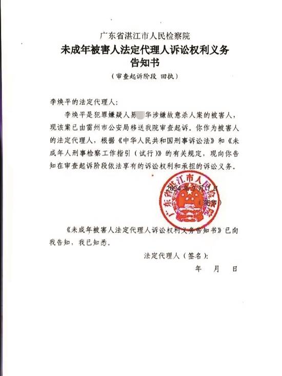 2024年2月,李海玉收到湛江市人民检察院于2月7日作出的《未成年被害人法定代理人诉讼权利义务告知书》。《告知书》显示,李某平是犯罪嫌疑人易某华涉嫌故意杀人案的被害人,现该案已由雷州市公安局移送湛江市检察院审查起诉。