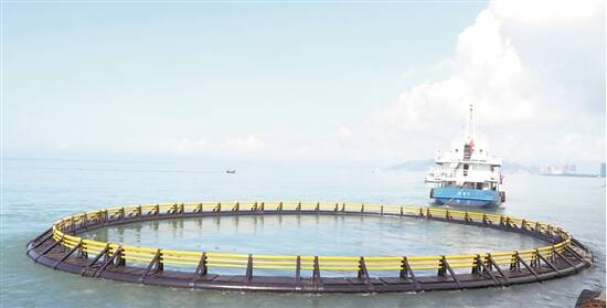 拉着网箱的轮船驶向江牡岛现代化海洋牧场