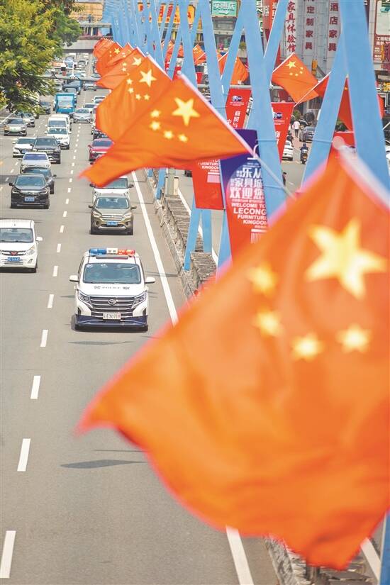 佛山市顺德区乐从镇,警车行驶在五星红旗飘扬的道路上