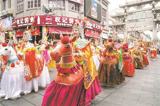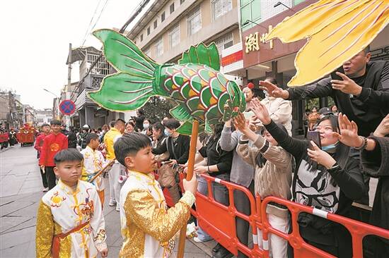 随着三声炮响,装扮一新的“新时代”彩车缓缓开出,巡游正式开始。标旗、舞龙、锣鼓、花灯、英歌舞……记者现场看到,不管是巡游人员的服装打扮,还是穿插其中的精彩节目,都充满着古色古香的韵味,旧时古城繁华的模样,就这样呈现在群众眼前。