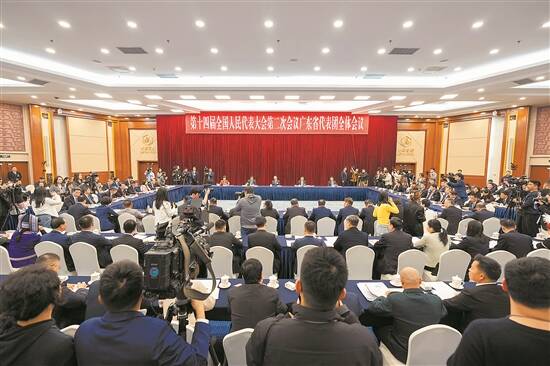 羊城晚报讯 3月7日上午,十四届全国人大二次会议广东省代表团在住地首都宾馆举行全体会议,继续审议政府工作报告,审查计划报告和草案、预算报告和草案,并面向中外媒体开放,来自102家境内外媒体的225名记者到会旁听采访。在发言环节结束后,媒体记者对代表进行集体采访。大家纷纷举手,就实施“百县千镇万村高质量发展工程”、做强实体经济、建设粤港澳大湾区、巩固外贸基本盘、促进海洋经济高质量发展等关系广东当前和长远发展、社会各界关心关注的话题进行提问。黄坤明、王伟中、张虎、覃伟中、曾进泽等代表分别作了回答,从不同角度广泛深入介绍我省贯彻落实党的二十大精神和习近平总书记视察广东重要讲话、重要指示精神,推进高质量发展、现代化建设取得的新进展新成效。