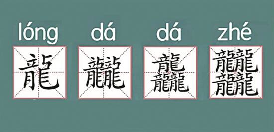 还有个生僻字是四个“龙”字叠加,但意思为啰唆、唠叨,与龙飞舞的样子无关