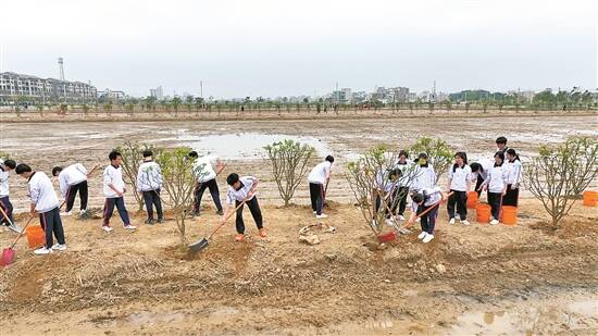 挥锹铲土、扶正树苗、堆起围堰、拎桶浇水……羊城晚报记者在植树现场看到,参与人员一派热火朝天,经过大家的辛勤劳作,新栽种的树苗整齐地屹立在机耕路旁,与一旁的农田、村道和村居互为映衬,形成生机盎然、整洁清新的绿美乡村景象。