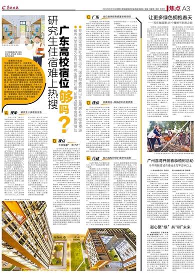 随着研究生招生规模的不断扩大,尤其是专业学位硕士研究生人数的快速增长,研究生住宿问题逐渐成为社会关注的焦点。日前,“研究生多到无宿舍可住”的词条冲上微博热搜,引发广大网友热议。羊城晚报记者采访了解到,针对研究生住宿问题,各高校采取不同的应对措施,目前广东高校普遍为全日制研究生提供住宿,并持续扩建新宿舍,宿位保障较充足。就加强高校学生宿舍建设,今年1月,国家发展改革委、教育部等7部门联合发文,要求多渠道扩大学生宿舍资源,并推动高校招生计划安排与宿舍面积达标挂钩。专家建议,高校可与校外资源合作,增加社会化运作,以多元路径破解研究生住宿紧张问题。