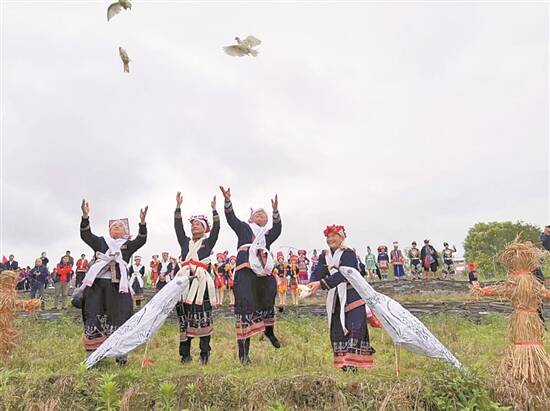 活动当天,瑶族师爷歌姆开启开耕祭祀仪式,并进行喂鸟、喂牛环节,祈求平安顺利、五谷丰登。祭祀仪式结束后,耕牛将被带到田里犁地,开启春耕第一犁,寓意春耕开启,祝愿禾黍飘香。