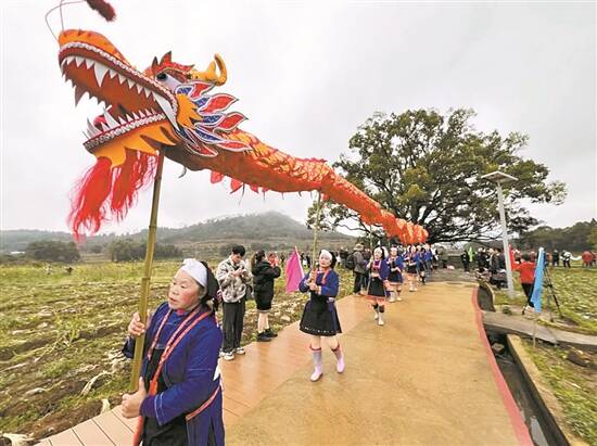 当地组成了瑶族师爷歌姆队、舞龙队、瑶舞队、农耕道具队、瑶族服饰队与舞春牛队,通过非遗巡游展示的形式走向田间地头,用欢快的舞姿,特色的歌声,在原生态民乐的伴奏下,载歌载舞,展示瑶族人民勤奋耕耘、善良朴实、尊重自然、利用自然的民族精神和民族智慧。