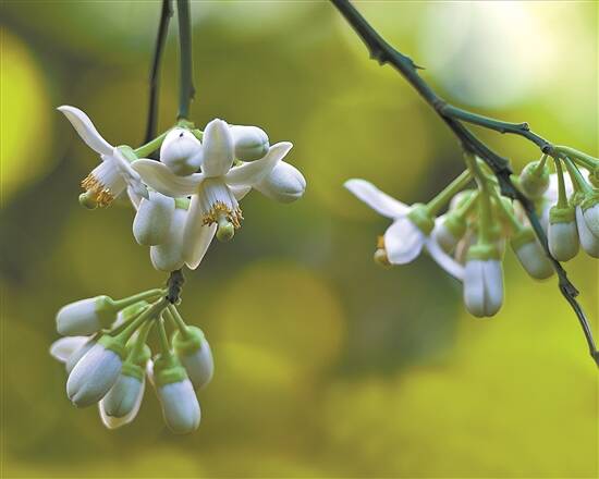 在梅县区松口镇蓬下村的柚园里,缕缕清香包裹着三五成簇的小白花,它们在柚树的绿色枝叶中,或含苞待放,或灿烂盛开,宛若白玉雕成的串串铃铛,清新脱俗。