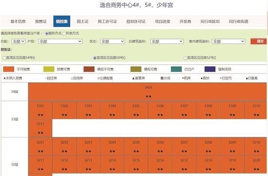 查阅阳光家缘可见,该项目主要呈现了两大问题。一是已经获得预售证的3栋楼宇(1-3栋),所有单位已经售完,但房源信息仅显示“已备案”,尚未有一套单位顺利过户。该批预售证最早的获得时间为2018年9月,批准预售产品为层高5米、面积四五十平方米的三房公寓,总价200万元内。二是余下的两栋单位(4栋、5栋)超600栋单位处于“未纳入预售、查封”状态,按照相关规定,此批房源须解封后才能继续交易。对于此类房源,购房者需要特别留意。