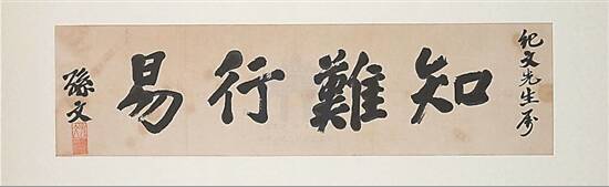 本次展览策展人朱志龙介绍,现场展出的孙中山亲笔题赠给刘纪文的“知难行易”字幅,属于尚未定级的文物,但极为珍贵且罕见。“知难行易”是孙中山的哲学思想,是其著作《孙文学说》重点阐述的哲学理念。