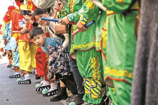 “英歌舞是我从小到大的一个追求梦想的过程。”大池英歌队队员黄俊文分享道。他今年21岁,已跳英歌舞4年。一开始跳的时候是在队伍里排名靠后的位置,虽然过程中遭遇过挫折,手上也伤痕累累,一度想着放弃。“后来看到跟我差不多年纪的人还在坚持,我也重新振作起来,更加努力地训练,希望能得到自己想要的那个成就和位置。”