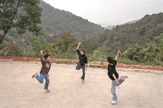 日常训练中,教练黄诗圣带领着队员在村庄附近的山里训练