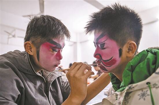 演出前,大池英歌队的队员们一早来到文化广场内画脸。据了解,完成所有人员的画脸至少需要4个小时