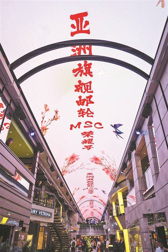 MSC荣耀号内素有“海上香榭丽舍大道”美名的荣耀大道由80米的超长LED天幕覆盖