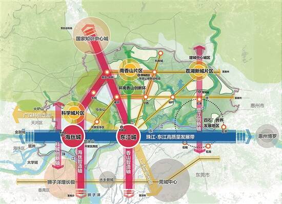 广州东部中心将建设成为开放高效绿色的门户之城、挺起产业脊梁的创智之城、青春活力共享的山水之城,主动承担广州国际商贸中心、全国先进制造业基地、全国性综合门户、国际科技创新中心重要承载地四大核心功能定位,北联知识城、南联狮子洋,总体构建“一带四轴、双城三片”的多组团空间结构。