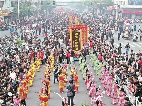 羊城晚报讯 记者赵映光、通讯员潮阳宣报道:锣鼓声、鞭炮声、喝彩声等交织在一起,英歌队、笛套音乐队、醒狮队、标旗队齐齐上阵……3月17日,“第十一届潮阳双忠文化节”在汕头市潮阳区举行,100多支潮汕民俗文化特色队伍“同台炫技”,近万人的巡游队伍绵延超8公里,巡游路线合计超18公里,其展演队伍数量之多、规模之大、内涵之丰富、影响力之广,在潮汕地区的“闹热”中堪称“天花板”级别。