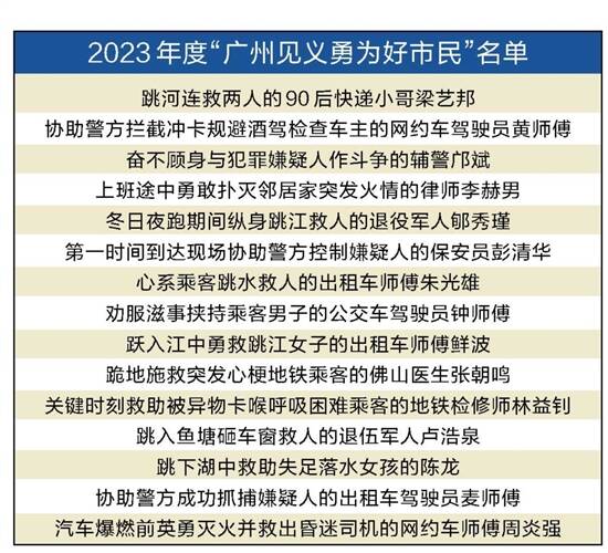 快递小哥跳河救人、出租车司机协助警方抓捕、公司职员扑灭突发火情……他们都是广州人身边的“平民英雄”。为弘扬见义勇为精神,3月20日,广州市委政法委、广州市见义勇为基金会联合举行2023年度“广州见义勇为好市民”、2023年度“广州市见义勇为先进集体”暨2024年第一批见义勇为慰问奖励仪式。