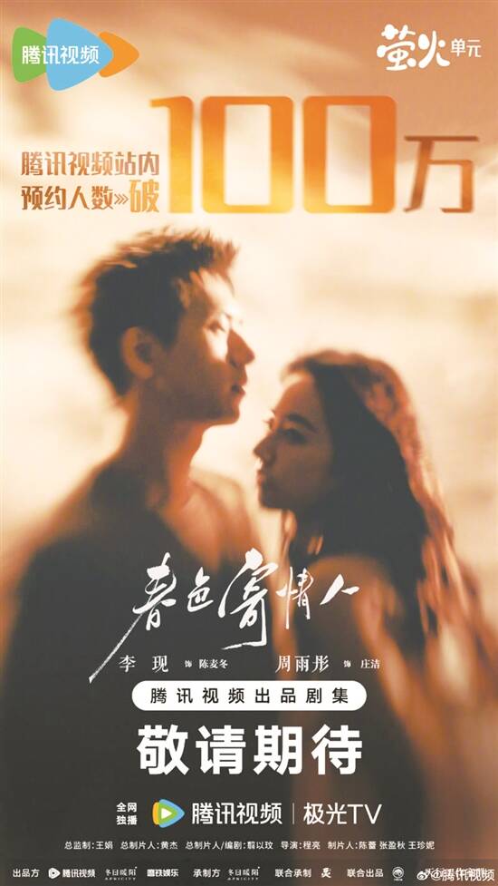 3月21日,李现、周雨彤主演的电视剧《春色寄情人》腾讯视频站内预约人数破100万。该剧以松弛治愈的市井烟火为基调,展现温暖有爱的群像人物故事。