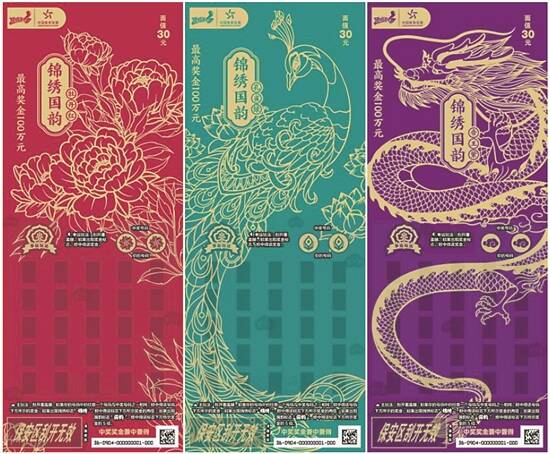 新款即开票票面设计典雅华丽,辅以牡丹、孔雀、中国龙3类具有代表性的中华传统元素,与3种颜色互相呼应,展现锦绣华彩国之韵味,传递吉祥、好运等美好寓意,让传统文化“跃然纸上”。