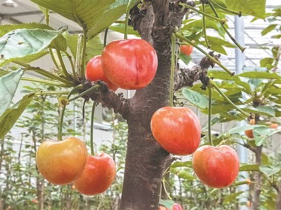 走进大樱桃种植基地,只见一棵棵在温控技术大棚内生长的大樱桃树都长得生机勃勃,树上结满了一颗颗可爱的心形大樱桃。进入成熟期,大樱桃正由黄转红,空气中弥漫着香甜的气息。