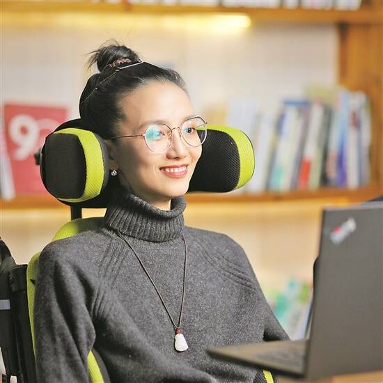 在一场直播里,葛敏扎着利落的丸子头,坐在一张特殊的轮椅上。这张轮椅上有一个头托支撑着她的后脑勺,使她的视线正好落在面前的电脑屏幕上。当直播中的主持人与她交流时,葛敏无法动口回答,只见她的眼球上下滚动,不一会儿面前的电脑屏幕就发出了电子音。