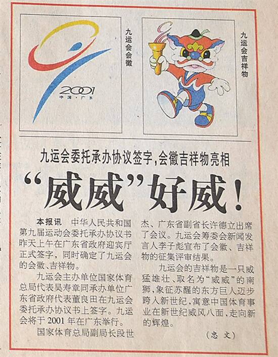 2001年,第九届全国运动会在广东举行,这是新世纪我国举办的第一个规模盛大的全国综合性体育盛会。恰逢新世纪之初,又遇体育盛事,人们的热情空前高涨。极具民间特色的九运会吉祥物南狮“威威”为营造热闹气氛添了把火,从街头的雕塑到孩童的发箍,“威威”成了那一年的“民间顶流”。