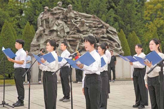 4日,广州市民政局在市银河烈士陵园举行“缅怀先烈·致敬英雄——2024年清明祭英烈”活动。图为华南理工大学工商管理学院学生代表朗诵《英雄花生生不息,英雄城未来可期》