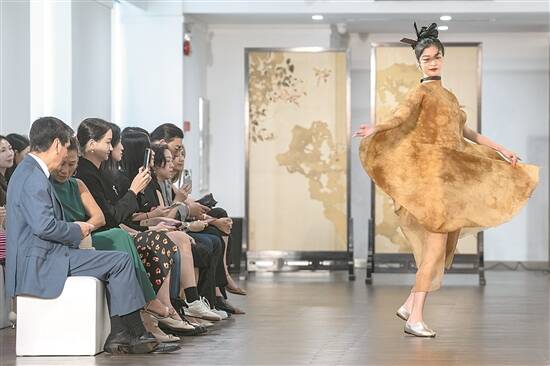 凯瑟琳的服装设计理念在于尊重和提升面料。为此,她研发了凸显香云纱自然美的剪裁方式和工艺。凯瑟琳告诉记者,本次的春夏新品包含了丝、麻、香云纱等手工草木染面料服饰,她在试图找出不同面料的“性格”。在这次“香云纱春夏秀”中,凯瑟琳在延续遵循自然的基调上,融入了创新的石榴皮染色技艺,带来了全新的氛围色调。同时,她用古老的多种绞缬染色法,赋予面料丰富隽永的色彩。“中国的传统手工业历史悠久,工艺精湛。我希望能通过自己的坚持和努力,让更多的人了解中国制造,不能小觑中国手工制作技艺。”