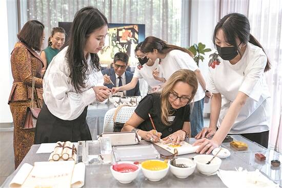 赞比亚总领事丹尼尔·穆弗拉·施穆恩扎欣赏了现场陈设的精美信笺、书籍,这些都以国家级非遗项目荣宝斋木版水印技艺印制。他还学着用朱红、青墨等颜色拓出了熊猫等中国传统绘画图案。丹尼尔告诉记者,他曾在读中学时接触过中国书法,但这是第一次用颜料、刷子等工具“绘”出有中国元素的图案。“木版水印体现了数千年前古人的智慧,也展现了人与自然的和谐相处。”他说。