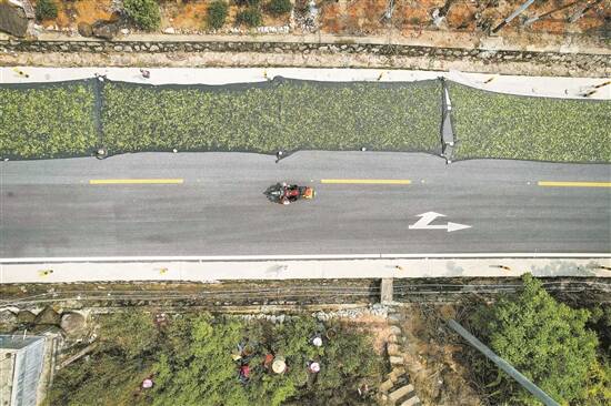 天气晴朗时,茶农便会把刚采摘的茶叶放在道路两边晒青