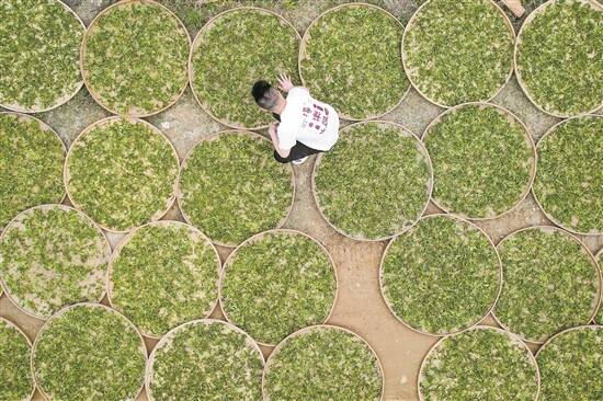 工人将刚采摘的茶叶铺在簸箕中晒青