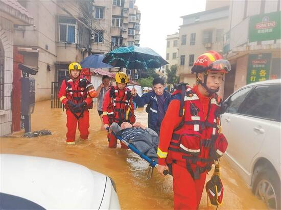 韶关浈江车站街道发生内涝,消防人员转移病患 韶关消防供图