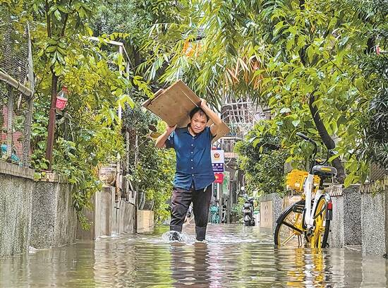 4月6日,广州市海珠区,一处内巷雨后出现积水,市民涉水而过 羊城晚报记者 梁怿韬 摄