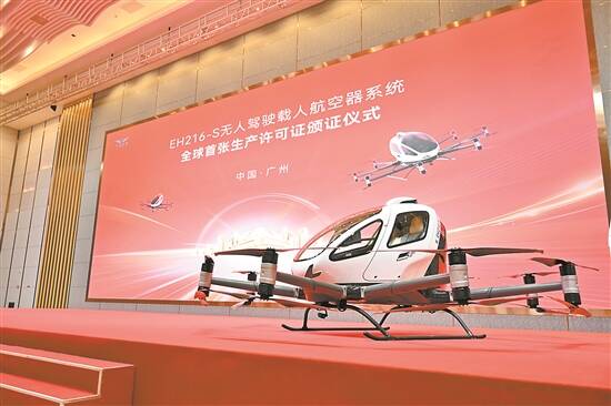 7日,亿航智能电动垂直起降飞行器(eVTOL)EH216-S无人驾驶载人航空器获得全球首张生产许可证(PC) 羊城晚报记者 严锦程 摄