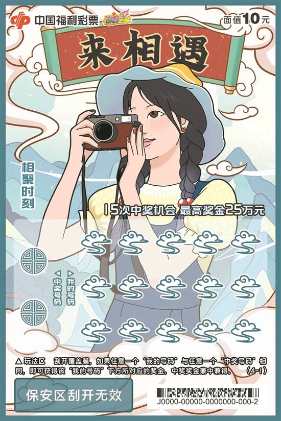 春天到来,万物复苏,刮刮乐即开票新票“相聚时刻”上市。据悉,该新票面值10元,最高奖金25万元,共包括“来相遇”“来相聚”“来相会”“来相逢”4款票面,票面设计精美,寓意美好。游戏方式简单有趣,刮开覆盖膜,如果任意一个“我的号码”与任意一个“中奖号码”相同,即可获得该“我的号码”下方所对应的奖金。中奖奖金兼中兼得。