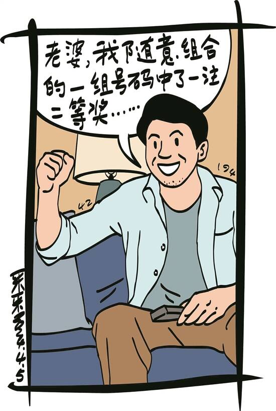 更好的事情还在后面,他晚上准时坐在电视机前,很有仪式感地等着开奖公告,忽然他朝卧室激动地大喊,“老婆,我随意组合的一组号码中了一注二等奖,奖金好几万块呢!”