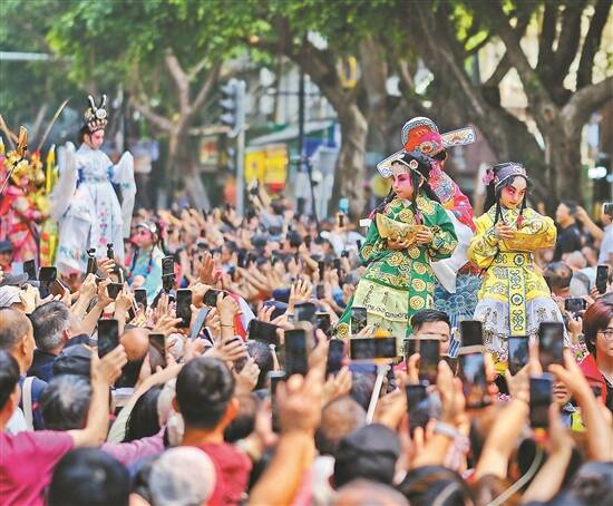 11日,广州市多区举办大型“三月三”民俗文化活动。图为荔湾区的巡游队伍吸引了大批街坊,现场喜庆热闹 羊城晚报记者 陈秋明 摄