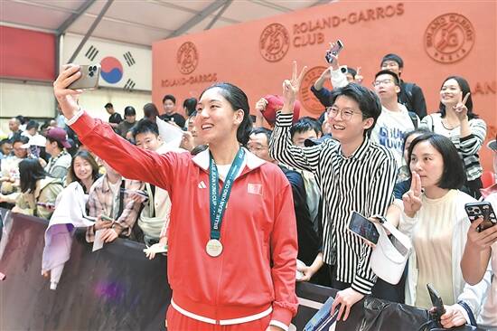 中国队选手王欣瑜在比赛后和球迷合影 新华社 发