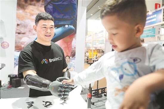 展会上,残障人士穿戴智能仿生手与小朋友互动 羊城晚报记者 梁喻 曾育文 潘俊华 摄