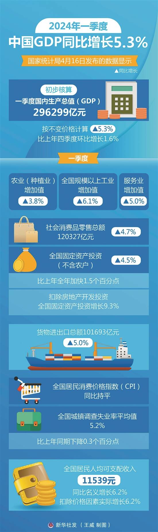 4月16日,国家统计局发布一季度国民经济运行数据。初步核算,一季度国内生产总值(GDP)296299亿元,按不变价格计算,同比增长5.3%,比上年四季度环比增长1.6%。