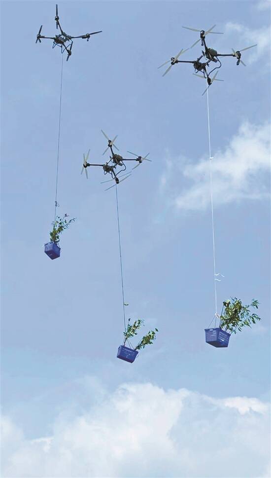 无人机携带苗木前往施工现场