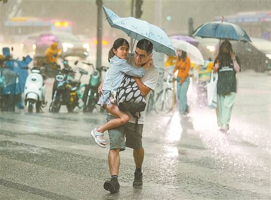 20日午后,广州遭遇强降水,大人抱着孩子撑伞前行 羊城晚报记者 梁怿韬 摄