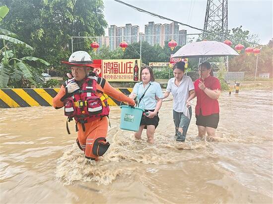 受连续强降雨影响,肇庆多地出现积水,消防救援人员引导涉险区域群众转移 通讯员供图