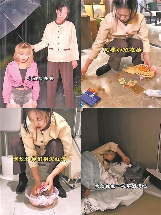 影视从业者如何看待作品的创新点?龙京晶认为,之前短视频也有类似的表达方式,《重生之我在霸总短剧里当保姆》爆火有其讨巧之处:“第一,选题内容不错,是很多人一直想吐槽的霸总文学,且视频取名《重生之XX》很有网文感;第二,今年霸总小程序微短剧风起,走入越来越多观众视野,观众对作品中挑出的霸总情节十分熟悉;第三,王妈、顾总等角色的表演是短视频用户喜欢的夸张、搞怪又外放的方式。”