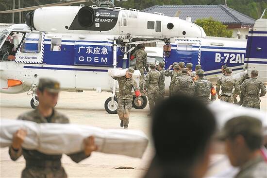 在江湾中学的操场上,广东应急直升机一次次降落,然后升空,载着一批又一批受灾群众飞向韶关市区。“昨天他们开始运一些老人和受伤的人,今天开始运其他居民。”在江湾中学,记者遇到了正在等待直升机撤离的丘嘉顺一家。