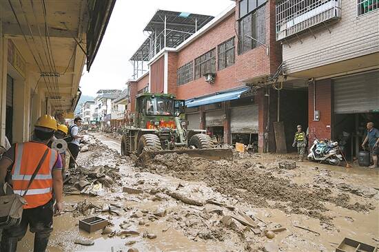 沿着318县道继续向江湾街道行进,记者很快被淤积至膝盖的淤泥挡住去路。洪水顺着山往下流,涌入街道,淹至小腿。救援队伍只能涉水前进,皮卡车穿梭其中运送物资,铲车则在水流中作业,清除淤泥。