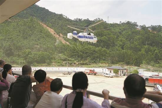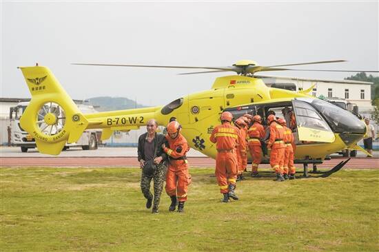 24日,为防范新一轮强降水,江湾镇部分居民通过直升机转运至位于韶关市区的广东省矿山救援韶关基地