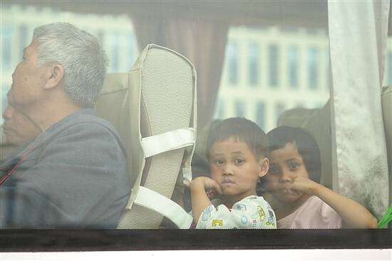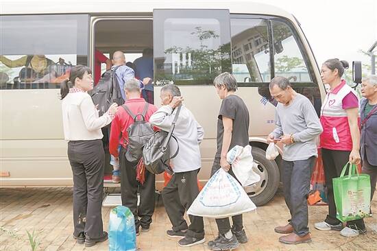 24日,韶关市武江区中医院,江湾镇居民在工作人员和志愿者的帮助下乘车前往安置点