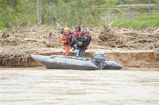 23日,中国救援广东机动专业支队救援人员穿越急流,解救受困居民