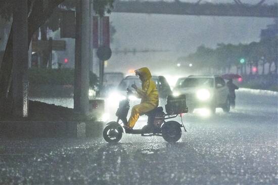 27日下午5时许,广州市雷雨大作,白昼如夜。珠江新城花城大道路段,外卖小哥冒着暴雨坚持送餐 羊城晚报记者 周巍 摄